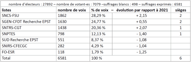 La liste de chercheuses, chercheurs, ingénieures, ingénieurs, techniciennes et techniciens présentée par le SNCS-FSU progresse et arrive largement en tête de cette élection avec 28,29% des suffrages exprimés. Ainsi, la liste présentée par le SNCS-FSU obtient deux sièges sur les six représentantes et représentants du personnel au conseil d’administration du CNRS.